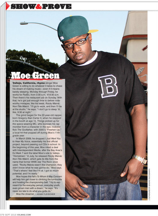 This past Monday I had a chance to sit down with Vallejo rapper, Moe Green, over Arizmendi pizza and what I thought would be just an interview turned out to be a very interesting conversation of goals, aspirations, and wisdom from an aspiring artist. Born and raised in Vallejo, California, Moe Green has given the bay area quite a buzz. With his debut album “Rocky Maivia: No Title Match”, Green shares to the world his thoughts and makes a statement with his performances. Moe Green has been featured in XXL’s September issue for “Show & Prove” and has been recognized by KMEL’s freshmen 10 for 2010. But he doesn’t stop there, Moe Green wreaks success and if you don’t believe him he will be sure to prove it to you.